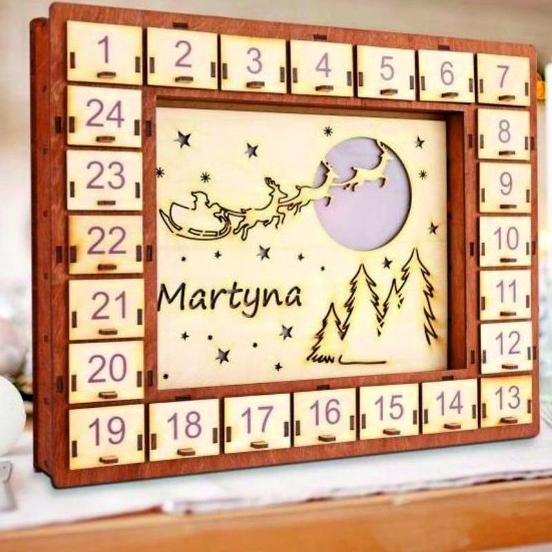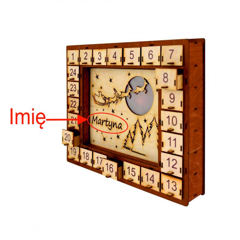 Wykonany precyzyjnie z drewna, zawiera 24 ponumerowane szufladki na małe upominki, słodycze lub liściki. Centralna część ozdobiona jest świątecznym motywem Mikołaja w saniach i imieniem wybranym przez Ciebie – to idealny prezent zarówno dla dzieci, jak i dorosłych.