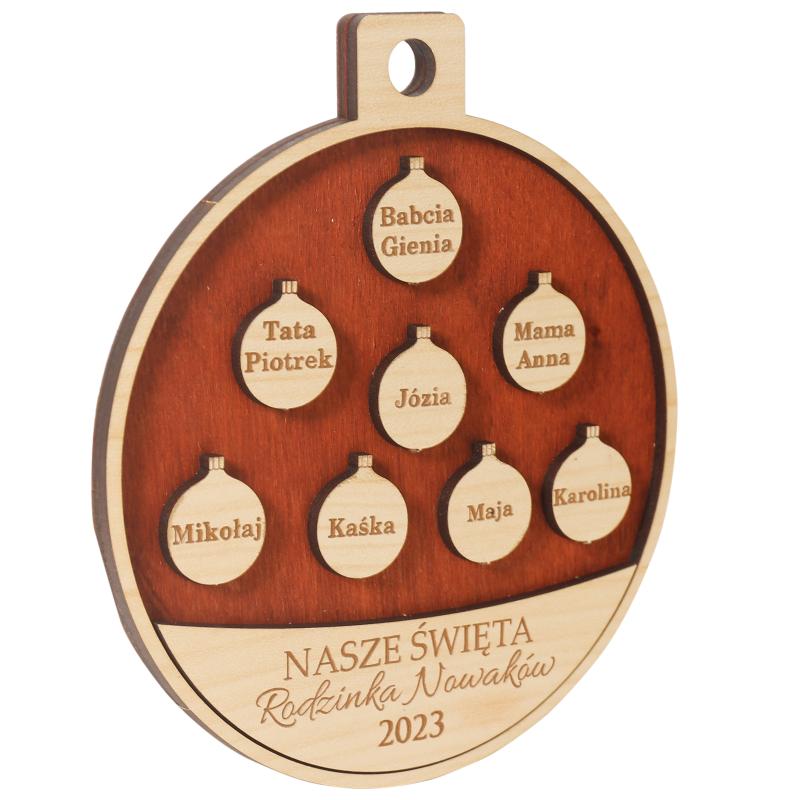 Pole Rodzina to miejsce, w którym mozna wpisać nazwisko rodziny, aby jeszcze bardziej dopasować ozdobę oraz prezent. Na naszym produkcie to "Rodzinka Nowaków", również można napisać samo nazwisko bez żadnych dodatkowych wyrazów.