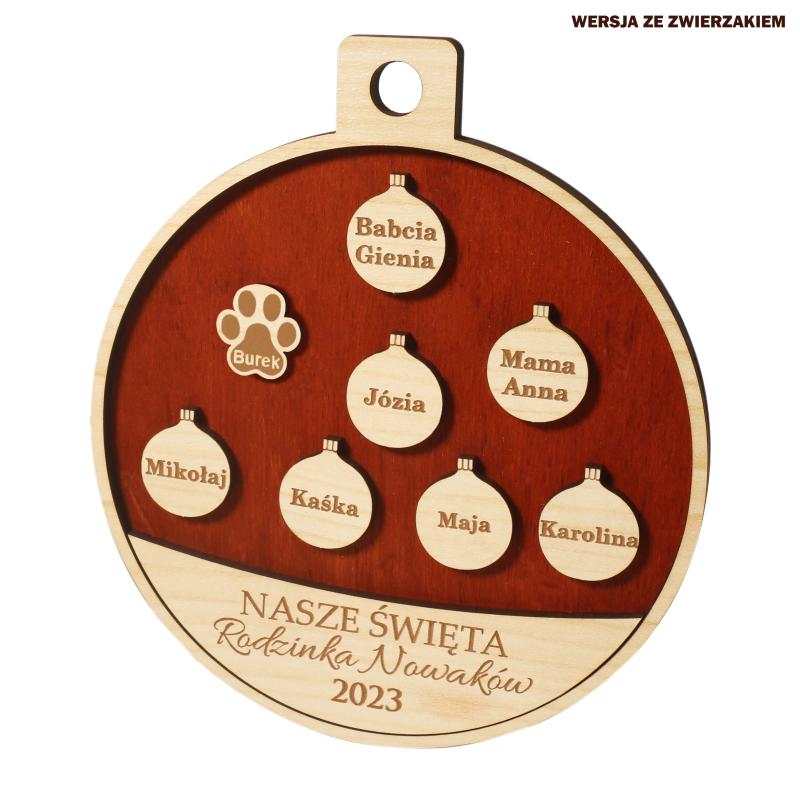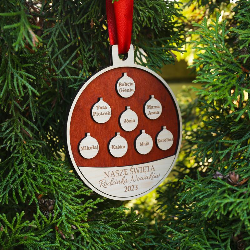Bombka zawieszka "Nasze Święta" to nie tylko dekoracja, to także pamiątka, która może być umieszczona na choince, w oknie lub w dowolnym miejscu, które chcesz udekorować. Personalizacja imionami członków rodziny sprawia, że staje się ona jeszcze bardziej osobistym elementem świątecznej dekoracji. To doskonały sposób na tworzenie magicznych wspomnień rodzinnych podczas świąt.