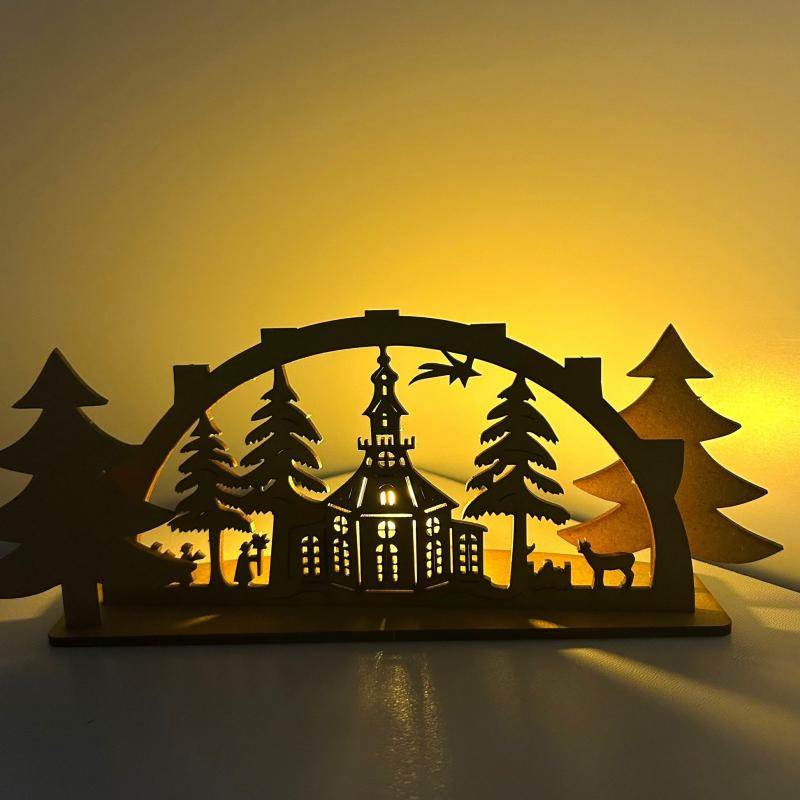 Elegancka dekoracja bożonarodzeniowa wykonana z naturalnego drewna to piękny dodatek do domu w okresie świąt. Ażurowy wzór przedstawia kościółek otoczony choinkami, gwiazdą betlejemską i świątecznymi detalami, co nadaje całości wyjątkowego charakteru.