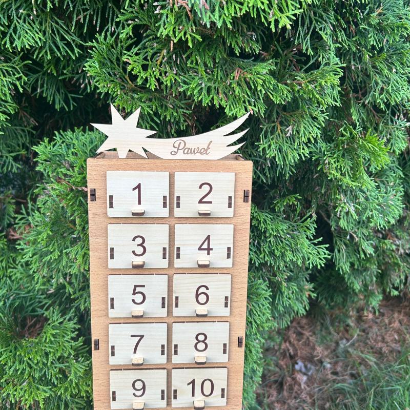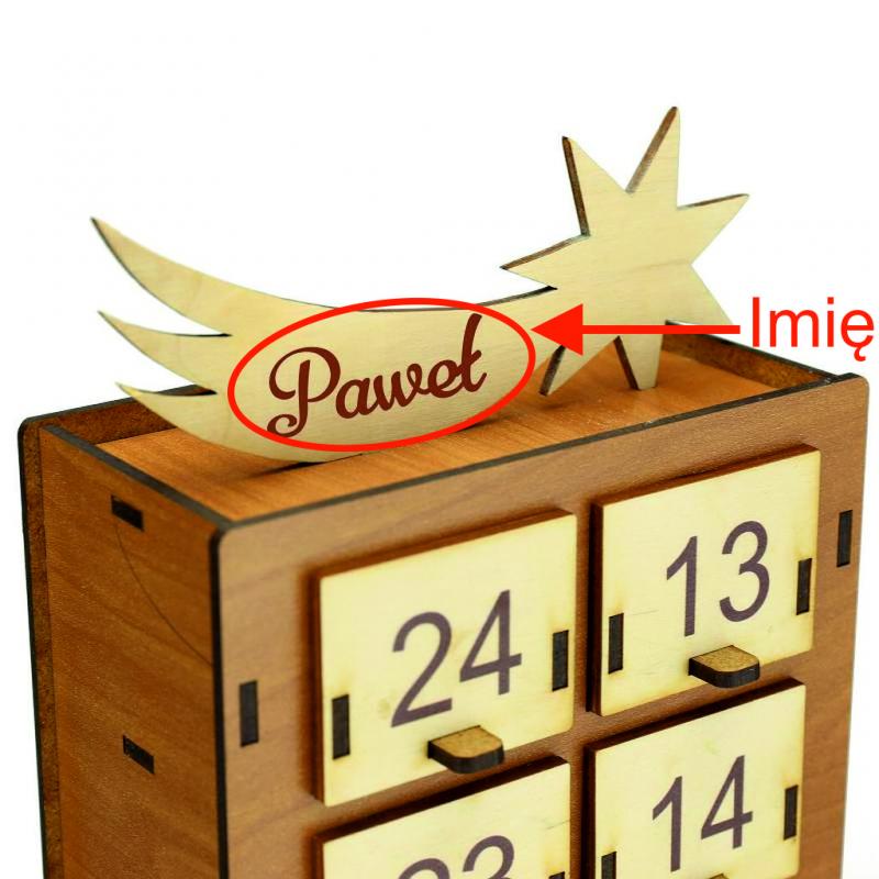 Kalendarz zdobi gwiazda betlejemska umieszczona na górze, która podkreśla jego świąteczny charakter. Wykonany z trwałego drewna, będzie piękną dekoracją, którą można wykorzystywać przez wiele lat, tworząc wyjątkową tradycję w domu.