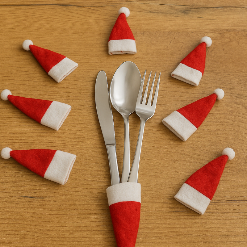 Świąteczny pokrowiec na sztućce w formie czapeczki Mikołaja to idealny dodatek na wigilijny stół, który doda każdemu nakryciu wyjątkowego, świątecznego charakteru. Wykonany z miękkiego filcu w czerwono-białych barwach, doskonale wpisuje się w bożonarodzeniowy klimat. Pokrowiec pomieści nóż, widelec i łyżkę, prezentując je w estetyczny i zabawny sposób.
