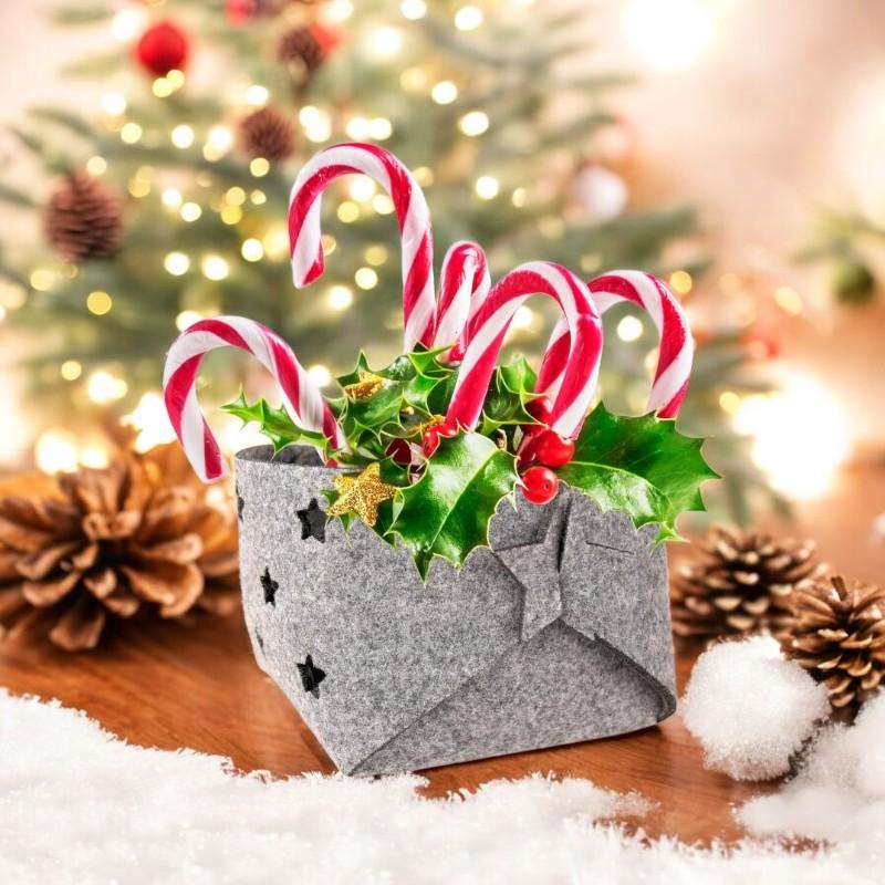 Ozdobne filcowe pudełko z wyciętymi gwiazdkami to urokliwy dodatek do świątecznego wystroju. Dzięki swojemu eleganckiemu designowi doskonale nadaje się do przechowywania słodyczy, drobnych prezentów, czy dekoracji świątecznych. Pudełko jest wykonane z wysokiej jakości filcu, co gwarantuje jego trwałość i estetykę.