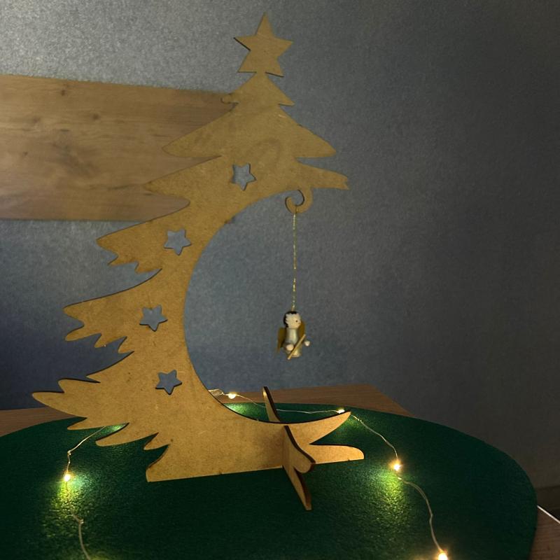 Choinka ta jest niewielkich rozmiarów, co sprawia, że idealnie nadaje się do mniejszych przestrzeni lub jako dodatkowa dekoracja świąteczna. Wykonana z drewna MDF, gwarantuje trwałość i stabilność. Jest to nietypowa choinka, ponieważ służy także jako wieszak na bombki, co dodaje jej funkcjonalności i uroku.