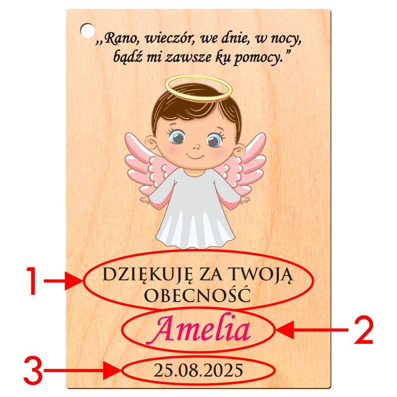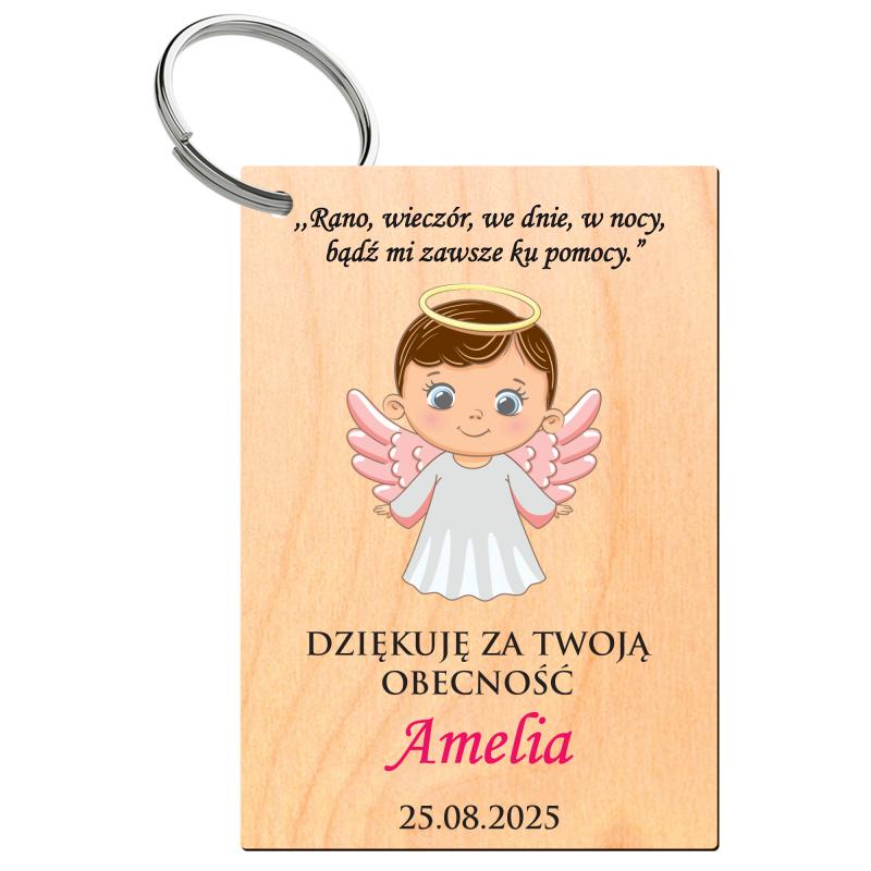 Uroczy drewniany brelok z funkcją magnesu w kształcie prostokąta z grafiką aniołka i personalizowanym podziękowaniem. Idealny upominek dla gości na chrzest, komunię lub inne religijne uroczystości.