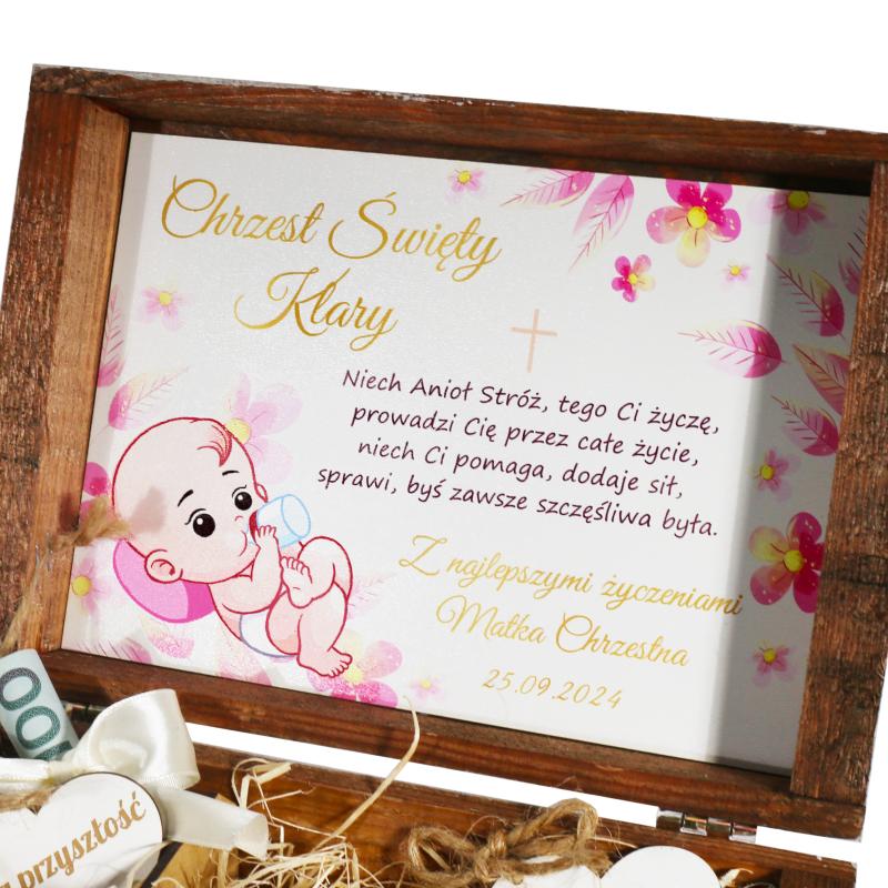 Imię to miejsce na umieszczenie imienia dziecka, które podchodzi do sakramentu. Na naszym produkcie jest to imię "Klara", które zostało odmienione, aby pasowało do napisu "Chrzest Święty" powyżej.