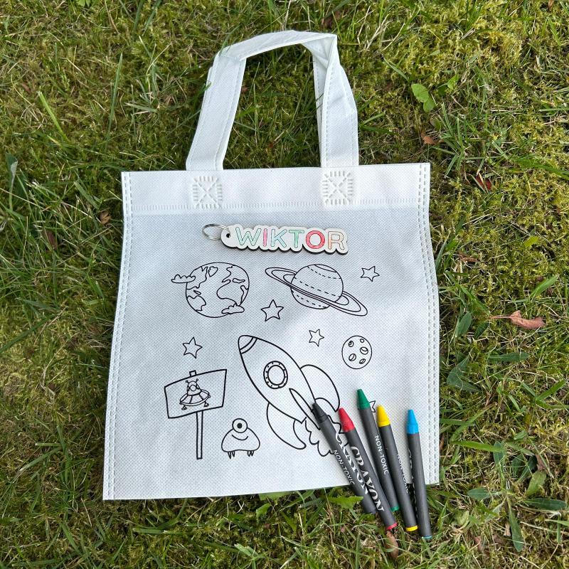 - W zestawie worek, kredki (5 kolorów) oraz brelok z imieniem.