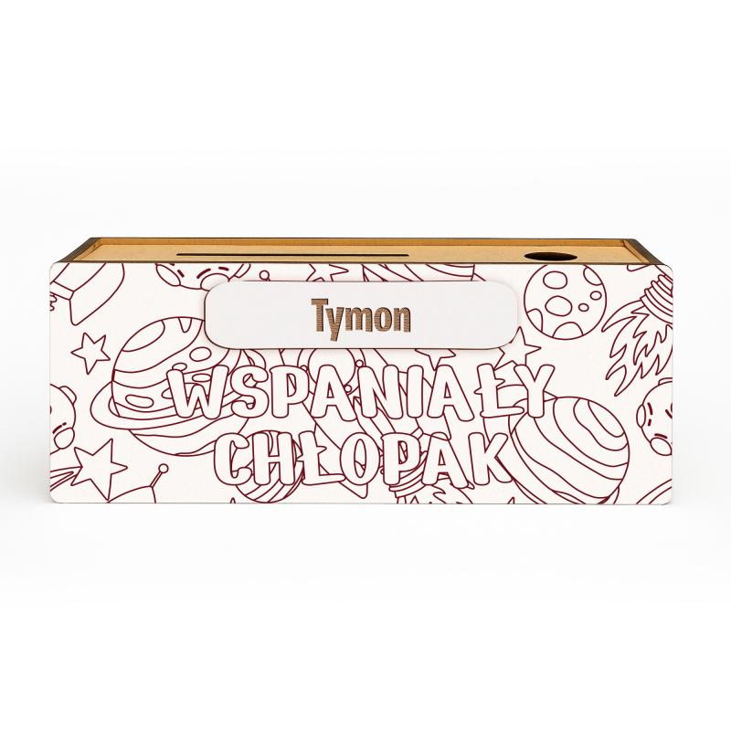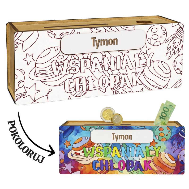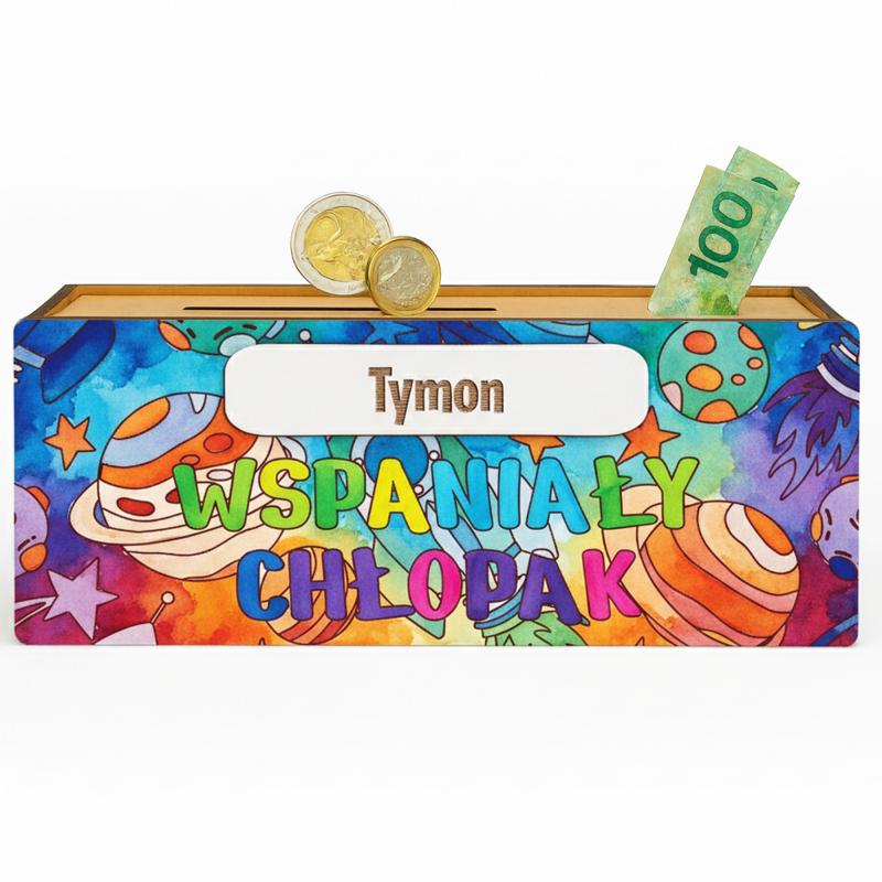 Personalizowana drewniana skarbonka z imieniem to kreatywny i praktyczny prezent dla chłopca.