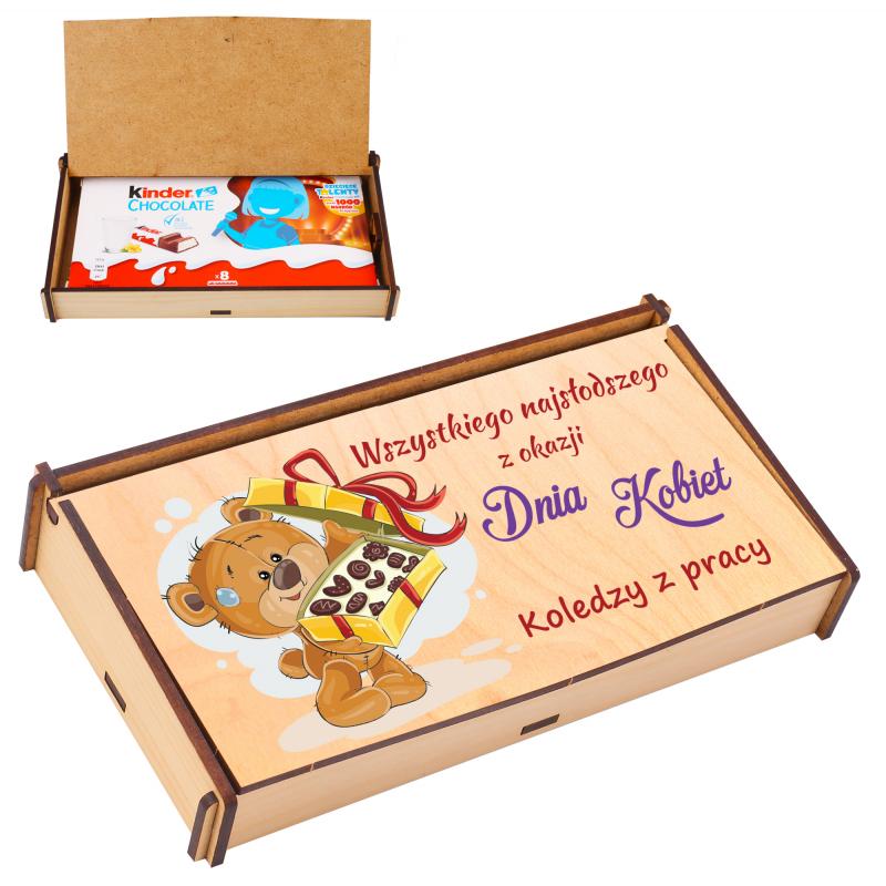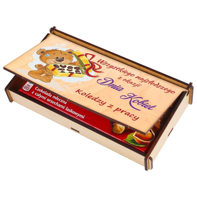 Eleganckie drewniane pudełko na czekoladę z dedykacją, idealne na prezent z okazji Dnia Kobiet. Na wieczku pudełka znajduje się kolorowa ilustracja uroczego misia, co dodaje uroku i podkreśla słodki charakter upominku.