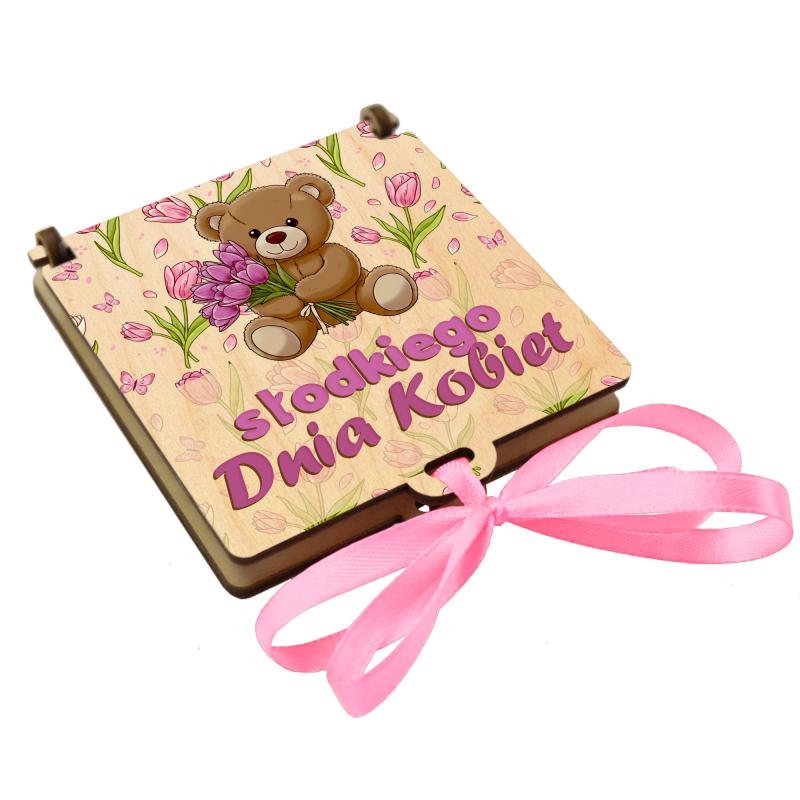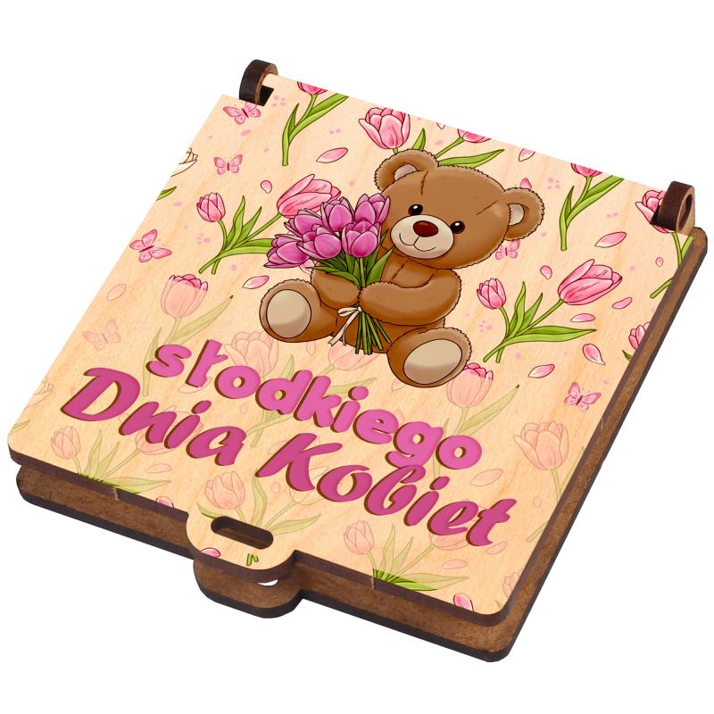 Motyw misia z bukietem tulipanów oraz napis Słodkiego Dnia Kobiet nadają całości radosny, wiosenny charakter.