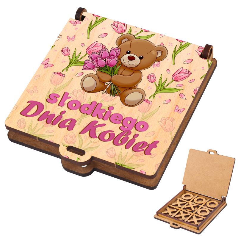 Drewniane pudełko z grą kółko i krzyżyk na Dzień Kobiet to uroczy i praktyczny upominek dla dziewczynek w szkole.