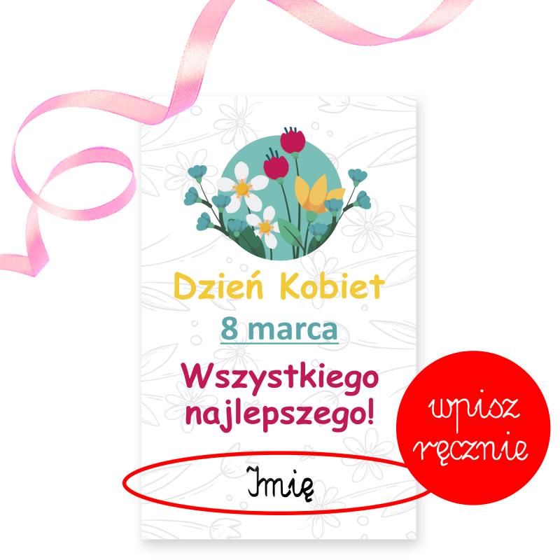 - kartka okolicznościowa gratis z napisem Dzień Kobiet 8 marca Wszystkiego najlepszego, z miejscem na wpisanie imienia oraz dołączoną wstążką do przymocowania