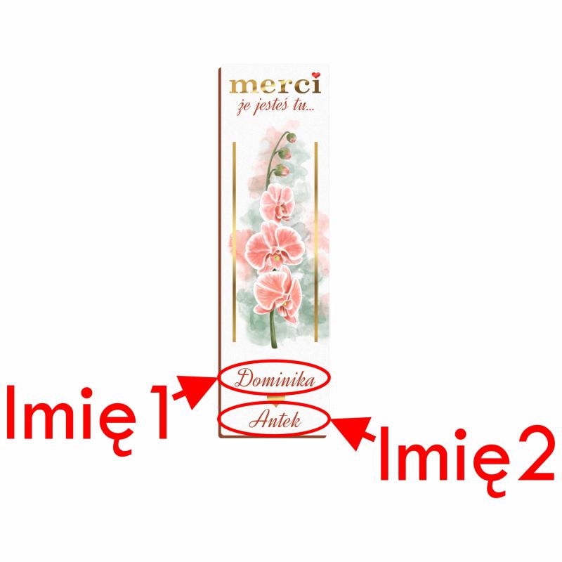 Prosimy wpisać tutaj dokładny tekst, jaki ma zostać umieszczony w tym miejscu. Przykład z naszego zdjęcia to: "Dominika". Jeśli imię będzie bardzo długie, zostanie pomniejszone tak, aby zmieściło się w docelowym polu. Jeśli chcesz, aby to miejsce było puste, zaznacz "Nie chcę personalizować tego pola (brak tekstu)".
