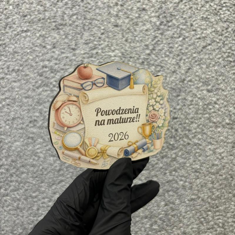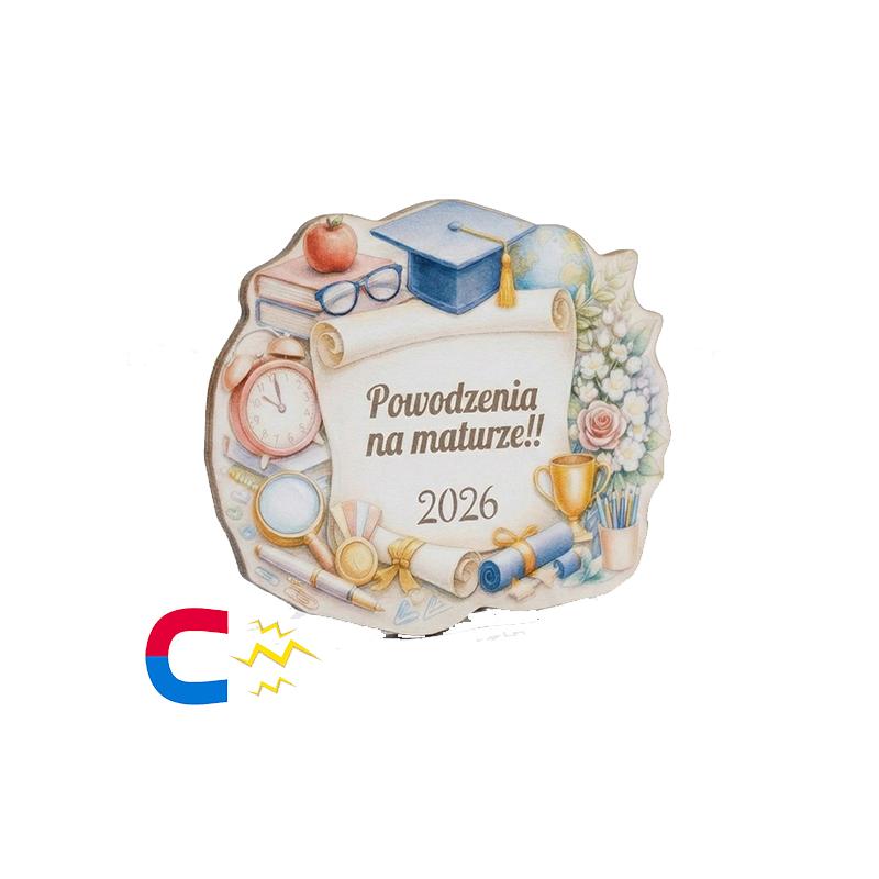 Magnes z nadrukiem na maturę z gratisowym paskiem magnetycznym to wyjątkowa pamiątka, która doskonale sprawdzi się jako drobny upominek dla maturzysty. Subtelna grafika z motywami szkolnymi oraz napis „Powodzenia na maturze!! 2026” nadają produktowi motywujący i pamiątkowy charakter.