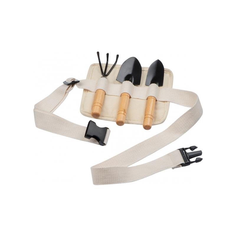Zestaw narzędzi ogrodniczych z płóciennym pasem – praktyczny prezent dla miłośników ogrodu.