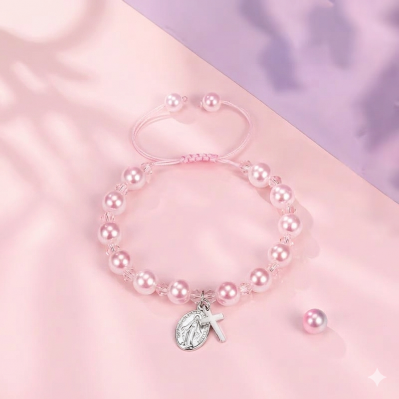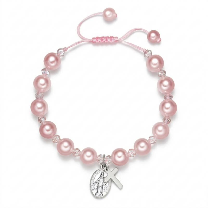Bransoletka komunijna różowa perełki krzyżyk medalik