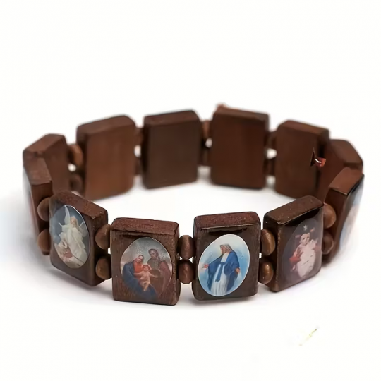 Drewniana bransoletka religijna z wizerunkami świętych to wyjątkowy dodatek o symbolicznym i duchowym charakterze. Wykonana z naturalnego drewna, składa się z segmentów ozdobionych kolorowymi wizerunkami postaci religijnych, które nadają jej unikalny wygląd.