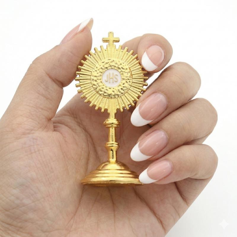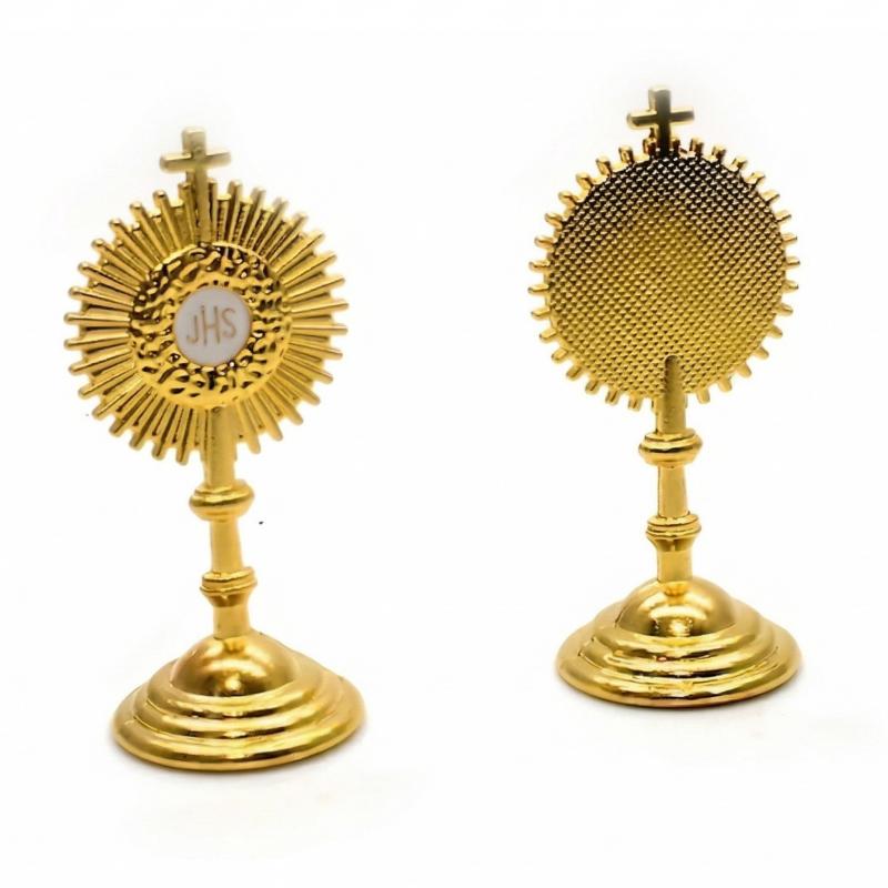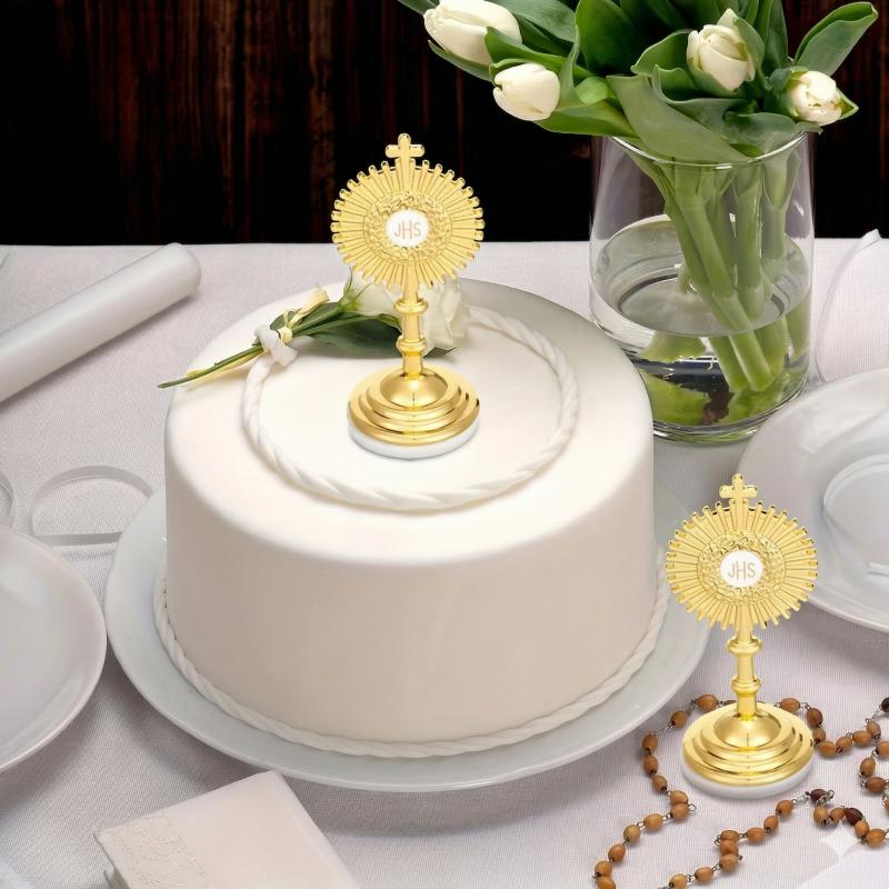 Elegancka złota figurka IHS to wyjątkowa dekoracja o religijnym charakterze, która doskonale podkreśli uroczystość Pierwszej Komunii Świętej.