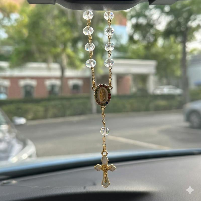 Elegancki złoty różaniec samochodowy z kryształkami to wyjątkowa zawieszka łącząca funkcję dekoracyjną i duchową.