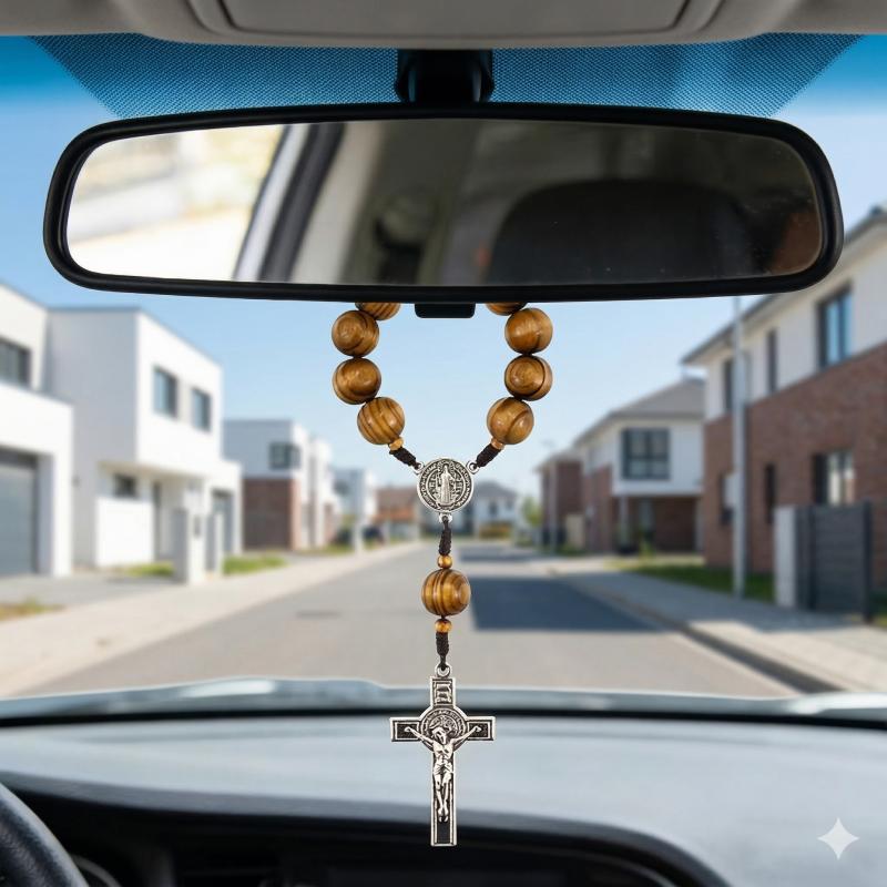 Klasyczny drewniany różaniec do samochodu z naturalnych koralików to elegancka i symboliczna zawieszka na lusterko.
