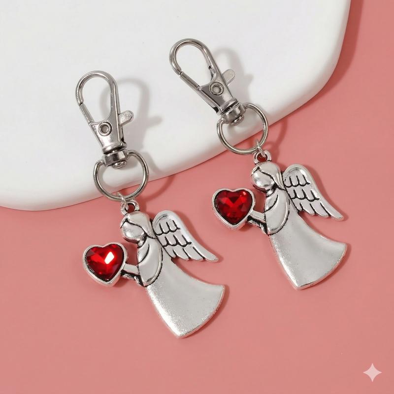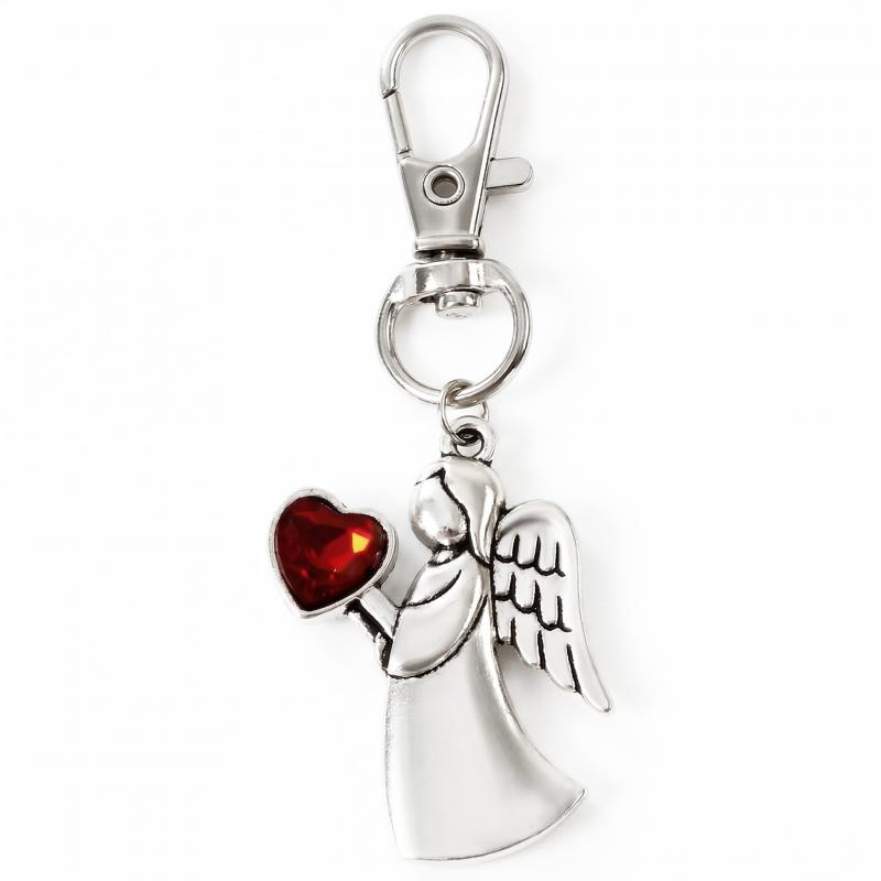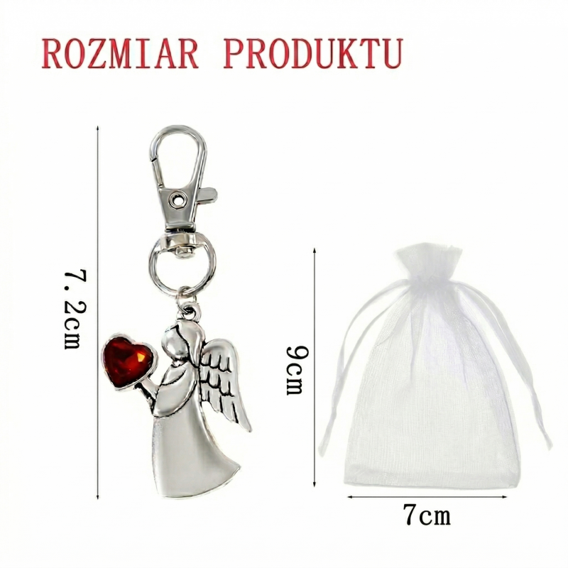 Brelok aniołek z sercem w zestawie z organzą to wyjątkowy, symboliczny upominek o eleganckim wyglądzie. Wykonany z metalu w srebrnym kolorze, przedstawia delikatną postać aniołka trzymającego czerwone serce, które przyciąga uwagę i nadaje całości wyjątkowego charakteru.