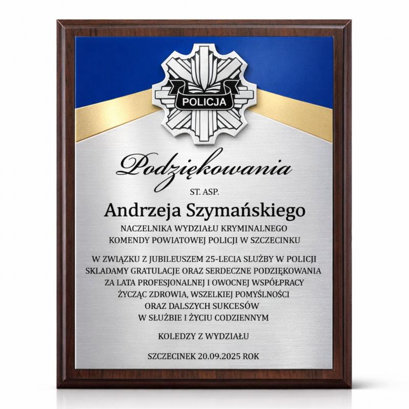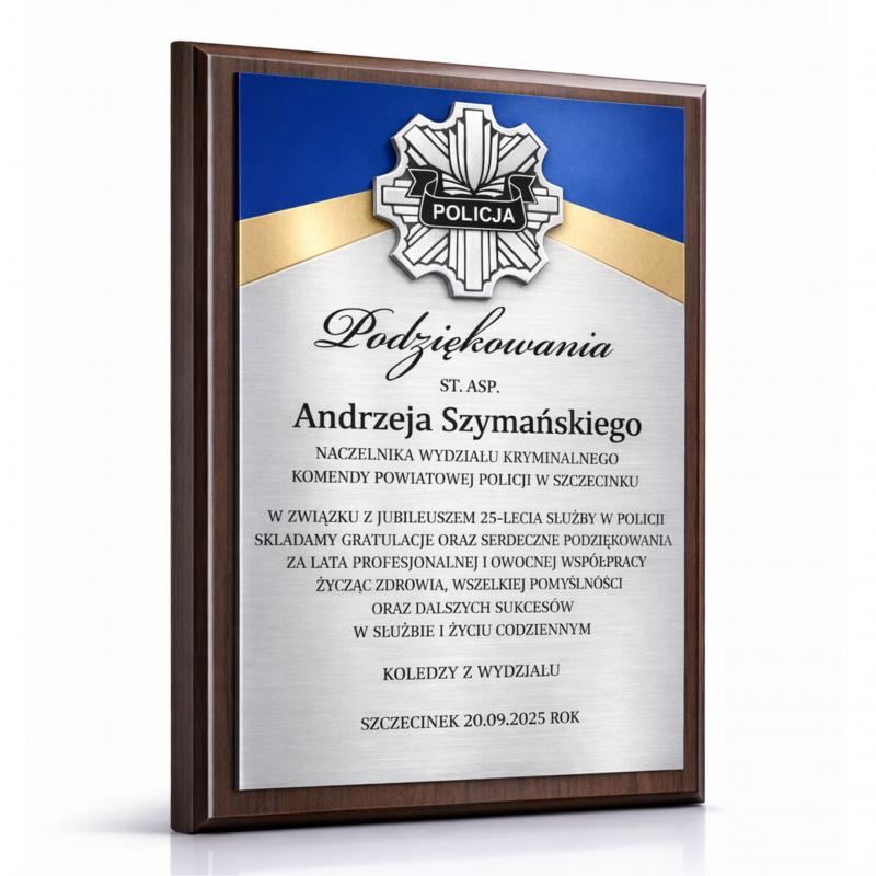 Grawerton Dyplom Uznania Policyjny Podziękowanie Policyjne na drewnianym podkładzie