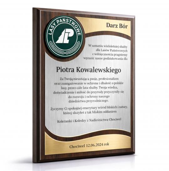 Elegancki grawerton w formie dyplomu podziękowania dla Nadleśnictwa czy członka Lasów Państwowych. Precyzyjny grawer na trwałej tabliczce osadzony na naturalnym drewnianym podkładzie. Doskonały do oficjalnych uroczystości, jubileuszy i wyrazów uznania.