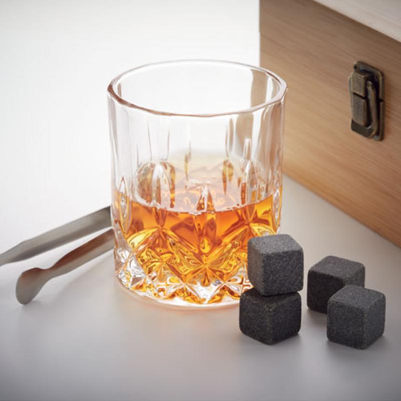 - Zawartość: dwie kryształowe szklanki (300ml), kamienie chłodzące do WHISKEY wielokrotnego użytku, bawełniana sakiewka oraz szczypce.