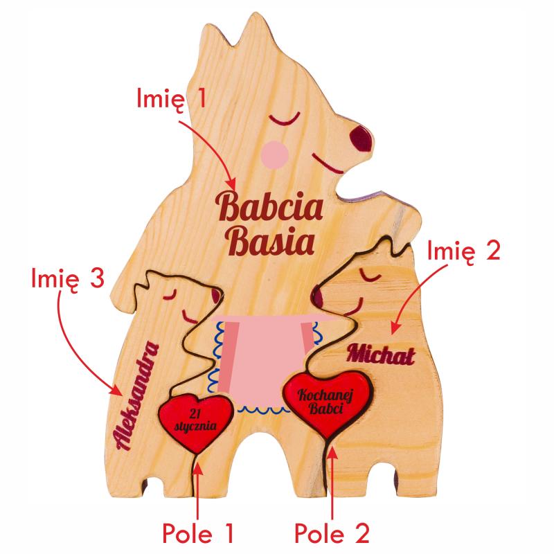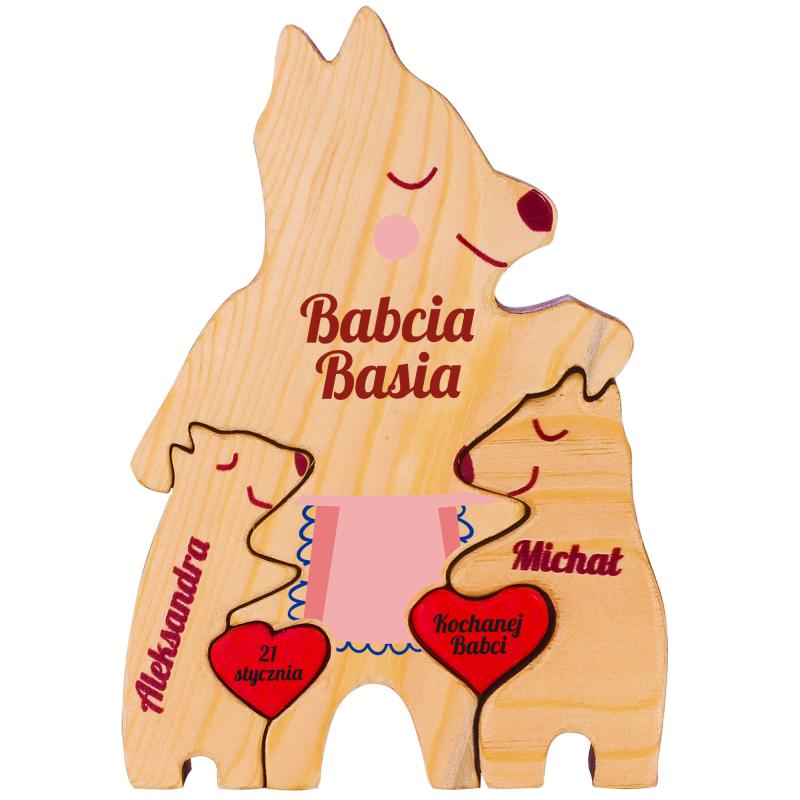 Z okazji Dnia Babci oferujemy wyjątkową, personalizowaną drewnianą układankę w kształcie przytulających się misiów. Każdy element układanki przedstawia członków rodziny, tworząc spójną całość.