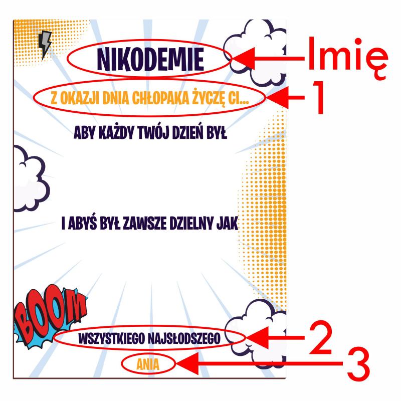 Prosimy wpisać tutaj dokładny tekst, jaki ma zostać umieszczony w tym miejscu. Jeżeli zamawiasz więcej niż jeden i chcesz, aby na każdym było inne imię, wpisz w tym polu te imiona, rozdzielając przecinkiem. Jeśli imię będzie bardzo długie, zostanie pomniejszone tak, aby zmieściło się w docelowym polu. Jeśli chcesz, aby to miejsce było puste, zaznacz "Nie chcę personalizować tego pola (brak tekstu)".