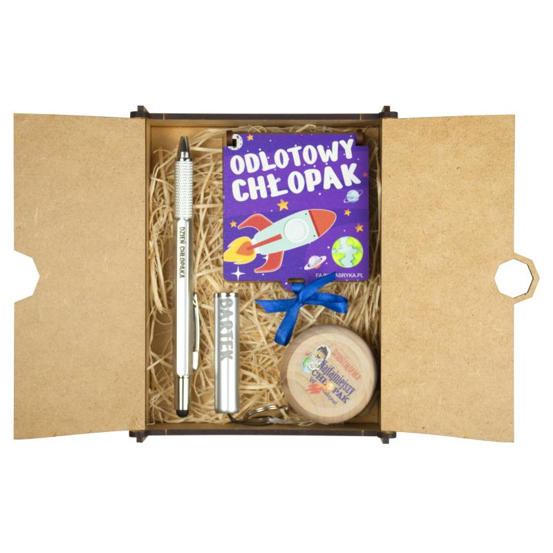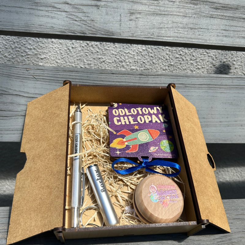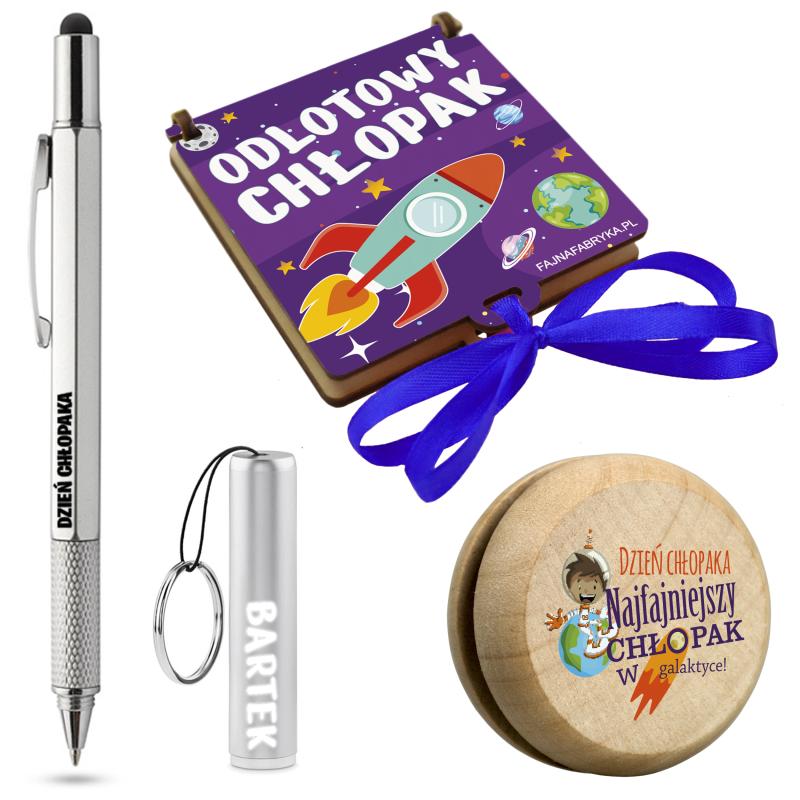 Ten kosmiczny zestaw na Dzień Chłopaka to wyjątkowy prezent, który sprawi radość każdemu chłopakowi. Zestaw zawiera różnorodne gadżety o tematyce kosmicznej, takie jak personalizowana latarka, długopis wielofunkcyjny, jojo oraz gra kółko i krzyżyk, które świetnie wpasują się w charakter święta.