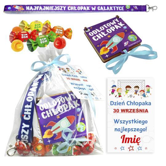 Prezent został przygotowany w formie kolorowego zestawu, który spodoba się każdemu chłopakowi niezależnie od wieku. W komplecie znajduje się słodka niespodzianka w postaci lizaków oraz cukierków, które zawsze cieszą się popularnością wśród dzieci i młodzieży. Dołączona zawieszka z napisem „Najfajniejszy chłopak w galaktyce” oraz ozdobna tabliczka „Odlotowy chłopak” podkreślają wyjątkowość okazji i sprawiają, że prezent nabiera spersonalizowanego charakteru. Całość zapakowana jest w przeźroczystą folię przewiązaną ozdobną wstążką, co nadaje całości elegancji i gotowości do wręczenia.