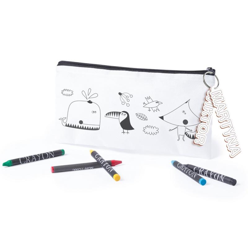 - W zestawie piórnik, kredki (5 kolorów) oraz brelok z imieniem.