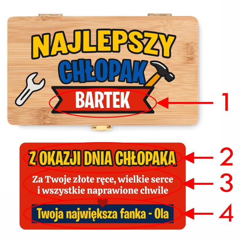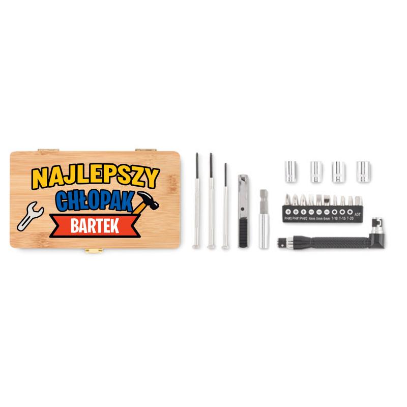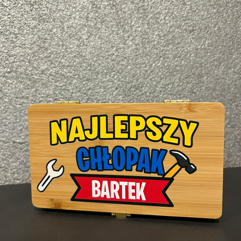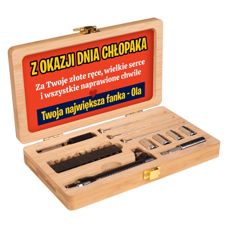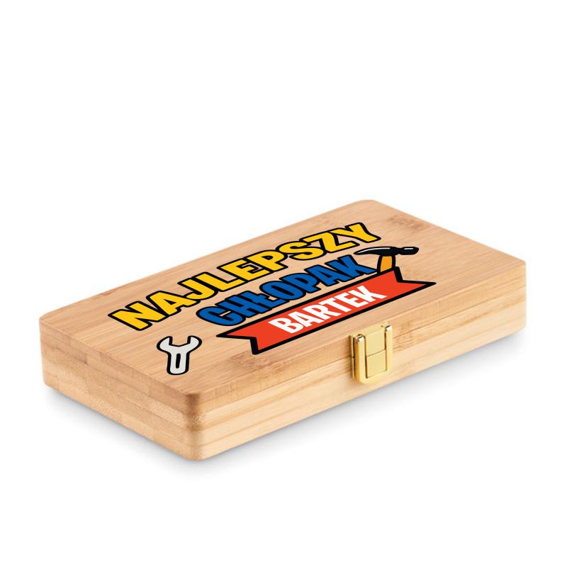 Szukasz oryginalnego prezentu na Dzień Chłopaka? Ten praktyczny zestaw narzędzi w eleganckim drewnianym pudełku z personalizowaną grafiką to trafiony wybór dla każdego złotej rączki! Na zewnątrz efektowny nadruk z imieniem, w środku – narzędzia, które przydadzą się w domu, garażu czy na działce.