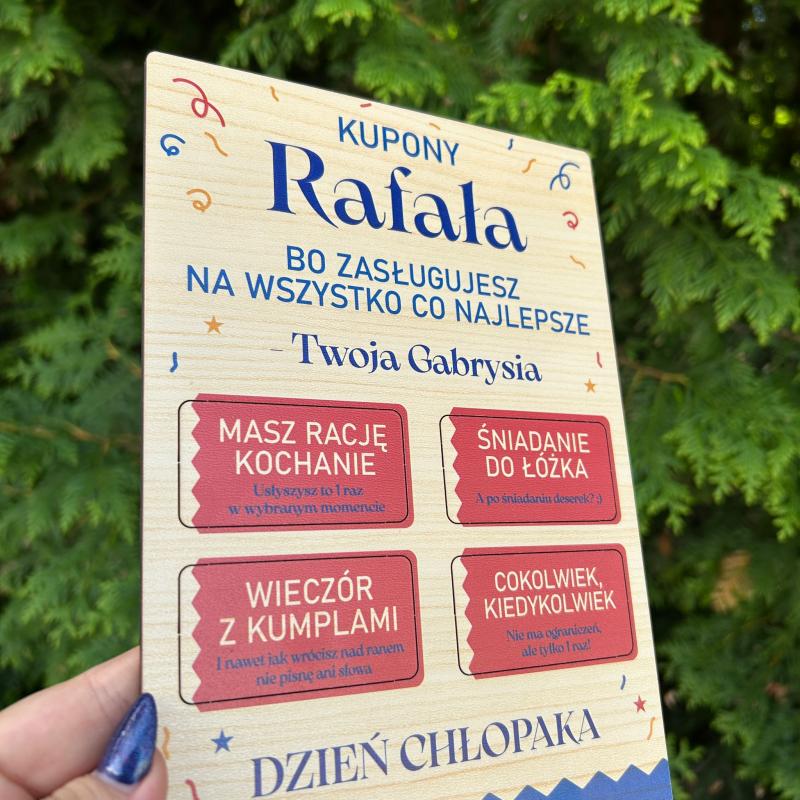 Drewniane kupony z imieniem i zabawnymi zadaniami. Oryginalny, personalizowany prezent na Dzień Chłopaka od ukochanej.
