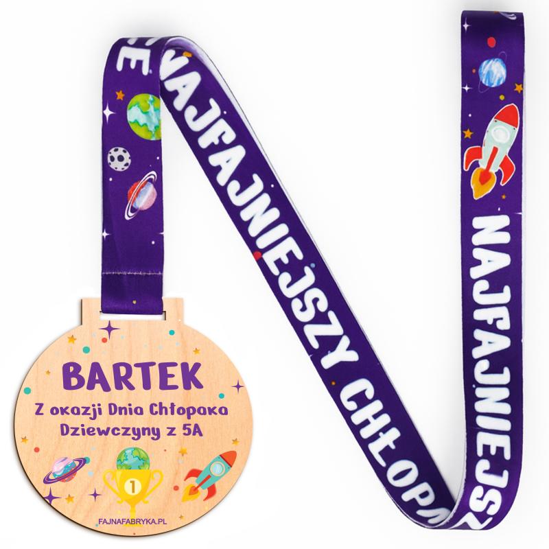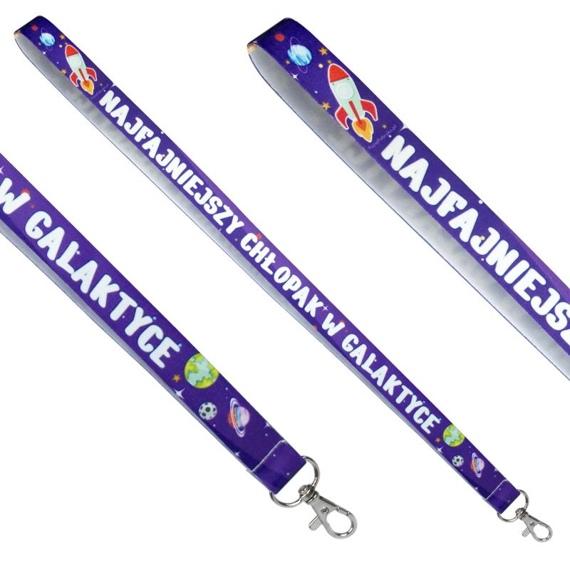 Całość dopełnia kolorowa smycz z nadrukiem „Najfajniejszy Chłopak w galaktyce” oraz motywami kosmicznymi, które współgrają z ilustracją na medalu, tworząc spójny i efektowny zestaw.