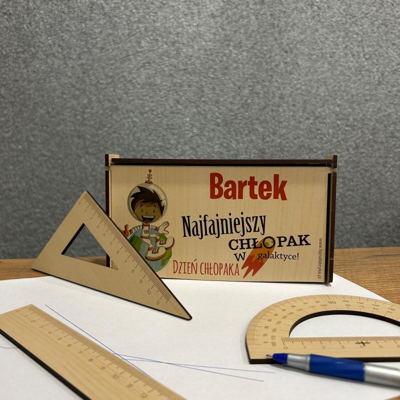 Funkcjonalny, kolorowy i estetyczny zestaw geometryczny to wyjątkowy prezent, który ucieszy każdego ucznia z okazji Dnia Chłopaka. W komplecie znajdują się podstawowe przybory matematyczne – linijka, ekierka oraz kątomierz – ozdobione grafikami tematycznymi i napisem „Dzień Chłopaka 30 września”. Wszystko zapakowane jest w trwałe, drewniane pudełko z imieniem chłopaka, które można wykorzystać również jako piórnik.