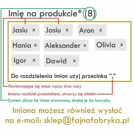 Jeśli masz trudności z wpisaniem imion lub jest ich duża liczba, skontaktuj się z nami sklep@fajnafabryka.pl. Chętnie pomożemy i zapewnimy wsparcie, aby zamówienie przebiegło bezproblemowo.