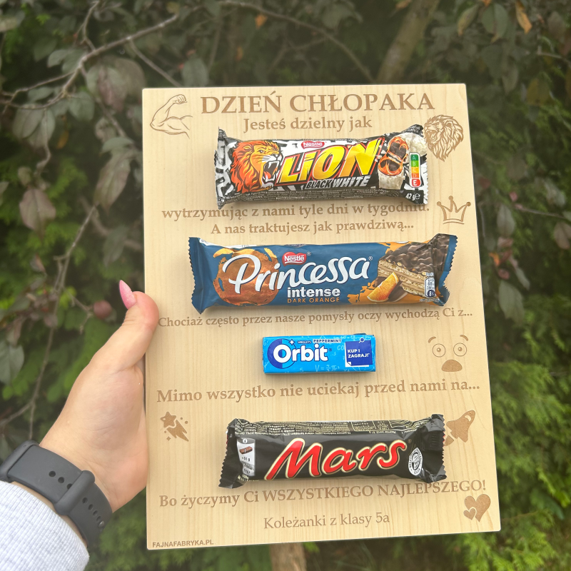 Tabliczka na słodycze to nie tylko słodka niespodzianka, ale również gest troski i uwagi. Niech chłopak poczuje się wyjątkowy, gdy otworzy tę tabliczkę i zobaczy Twoje słowa skryte wraz z przepysznymi słodyczami.