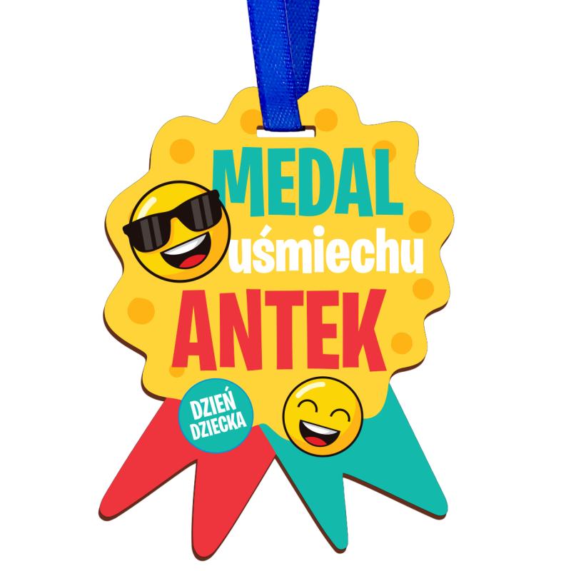 - Order z napisem „Medal Uśmiechu” zawiera imię dziecka i kolorową wstążkę.
