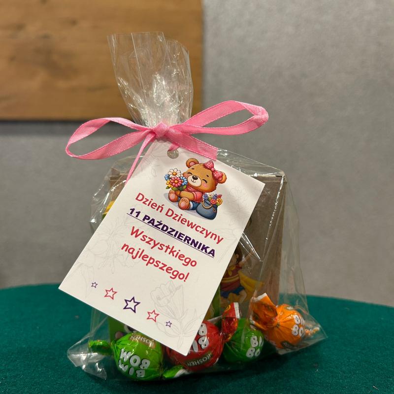 - Kartka okolicznościowa GRATIS z napisem „Dzień Dziewczyny, 11 października, Wszystkiego najlepszego!”, z miejscem na wpisanie imienia, co nadaje prezentowi osobisty charakter. Do niej dołączona zostanie wstążka, dzięki której łatwo będzie można dołączyć kartkę do gotowego zestawu.
