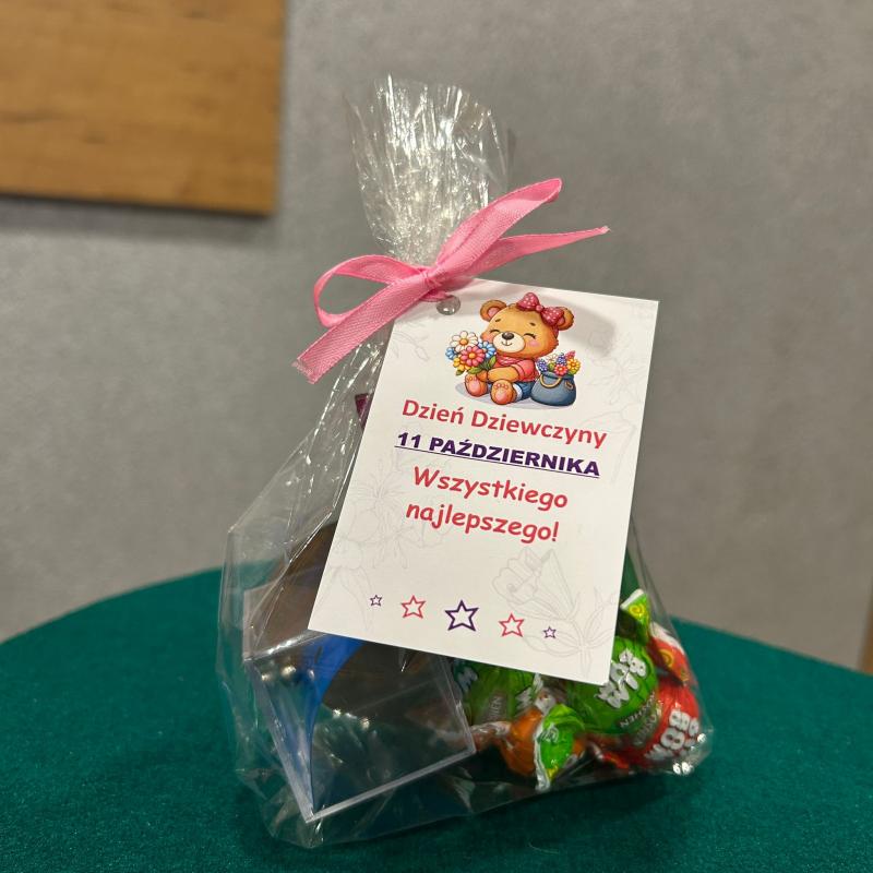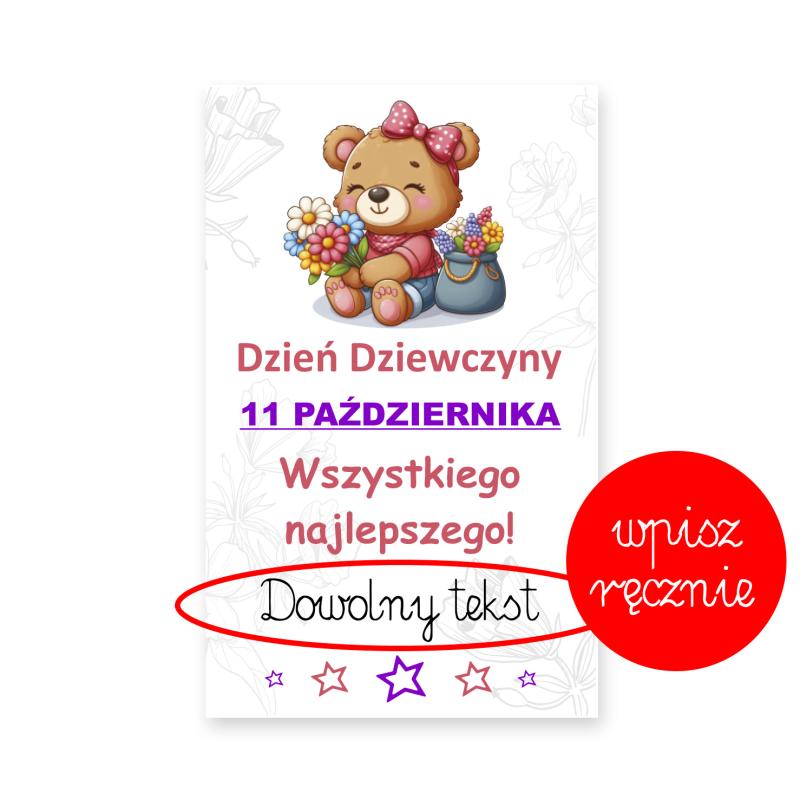 - Kartka okolicznościowa GRATIS z napisem „Dzień Dziewczyny, 11 października, Wszystkiego najlepszego!”, z miejscem na wpisanie imienia, co nadaje prezentowi osobisty charakter. Do niej dołączona zostanie wstążka, dzięki której łatwo będzie można dołączyć kartkę do gotowego zestawu.