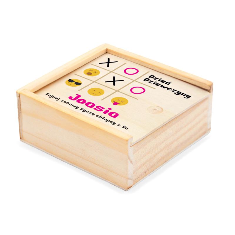 Wykonana z naturalnego drewna, trwała i bezpieczna. W zestawie znajdują się kostki z symbolami „X” i „O”, które umożliwiają wielokrotne rozgrywki bez potrzeby rysowania planszy. Wieczko pudełka ozdobione jest kolorowymi buźkami i dedykacją z okazji Dnia Dziewczyn.