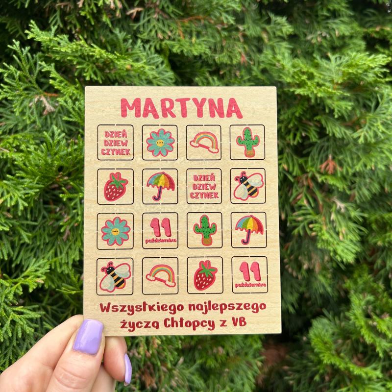 Kieszonkowa, drewniana gra memory to praktyczny i zabawny upominek. Kompaktowy rozmiar sprawia, że zmieści się w piórniku lub plecaku, więc można zabrać ją wszędzie.
