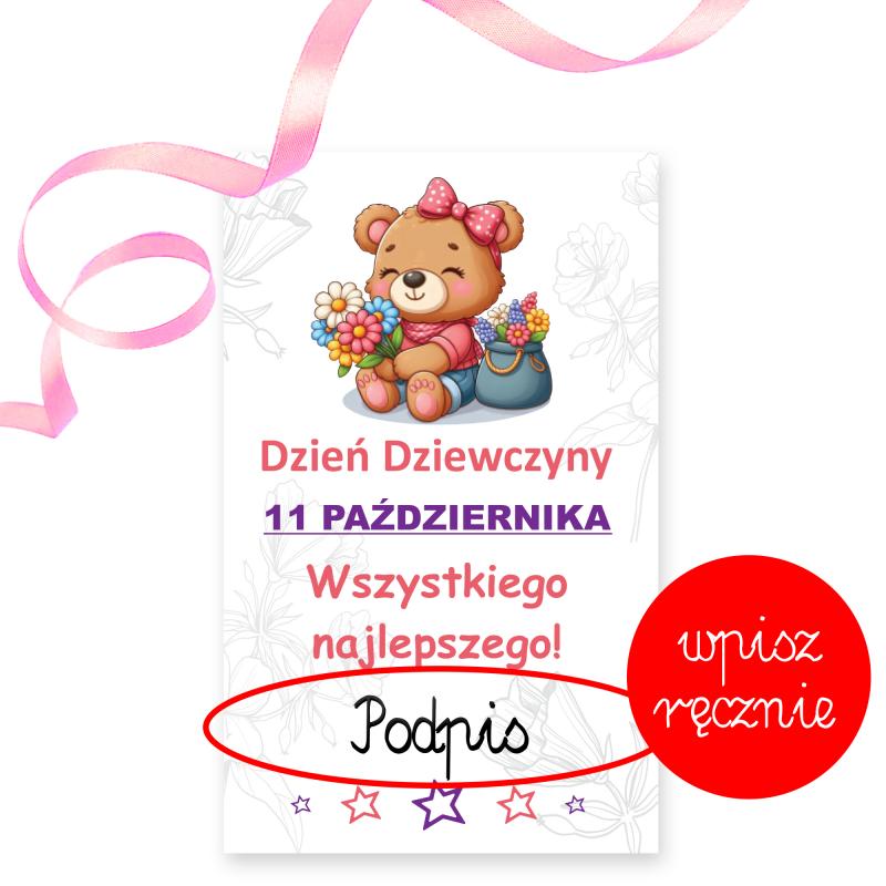 - Kartka okolicznościowa z napisem „Dzień Dziewczyny 11 października, Wszystkiego najlepszego!”, z miejscem na podpis, co nadaje prezentowi osobisty charakter.