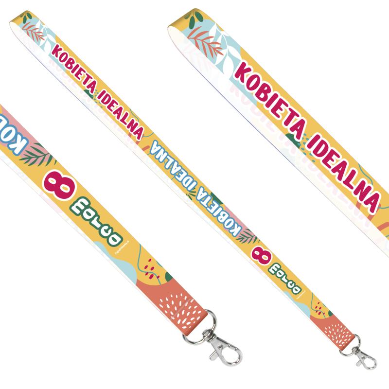 - Smycz z kolorowym wzorem z napisem „KOBIETA IDEALNA”, która świetnie sprawdzi się do przypięcia kluczy czy innych drobiazgów.