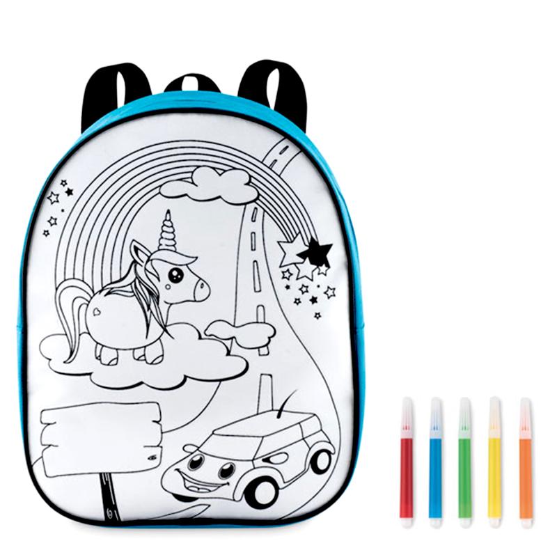 - W zestawie plecak, mazaki (5 kolorów) oraz brelok z imieniem.