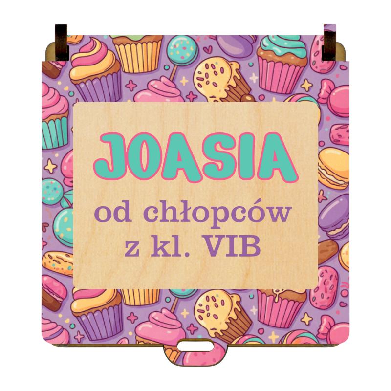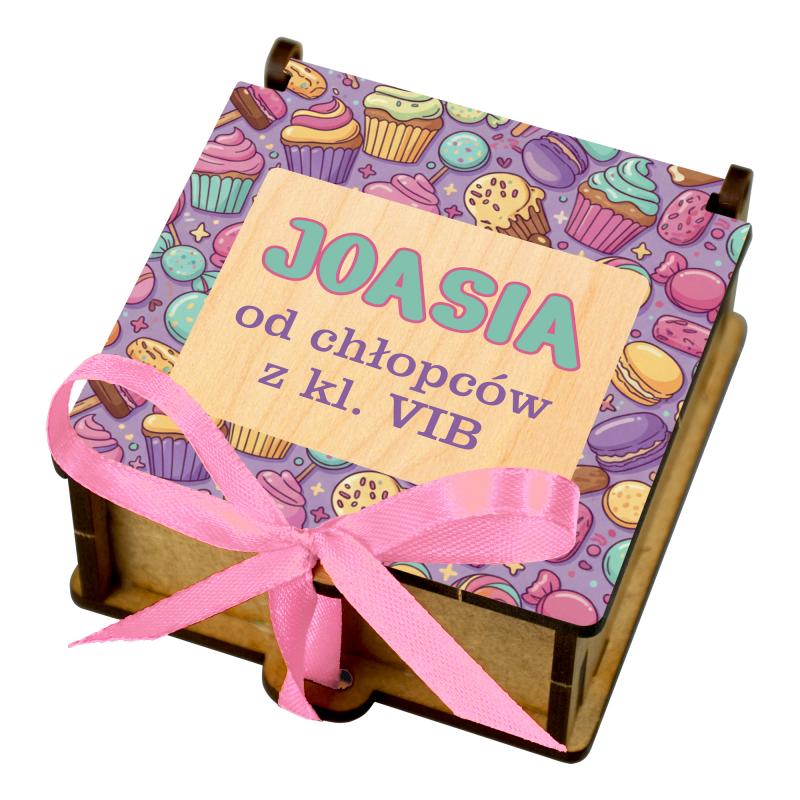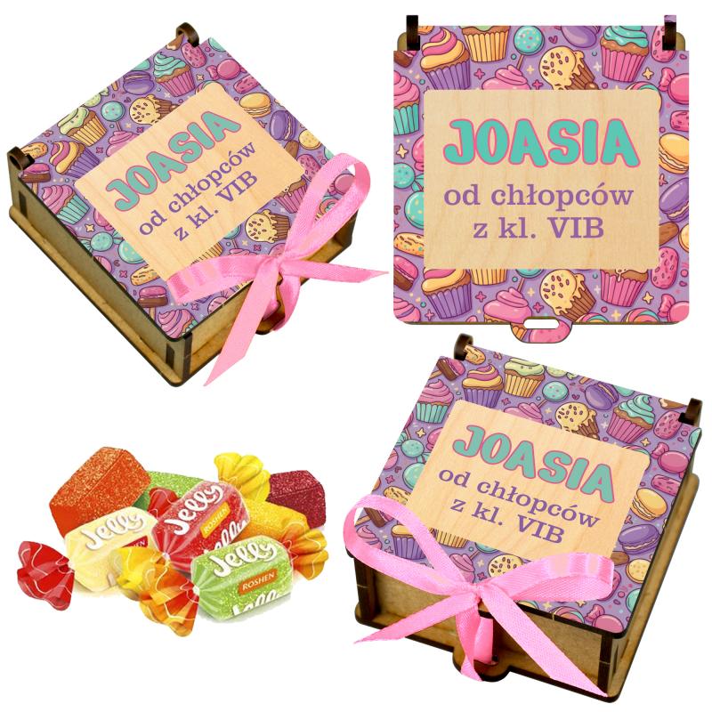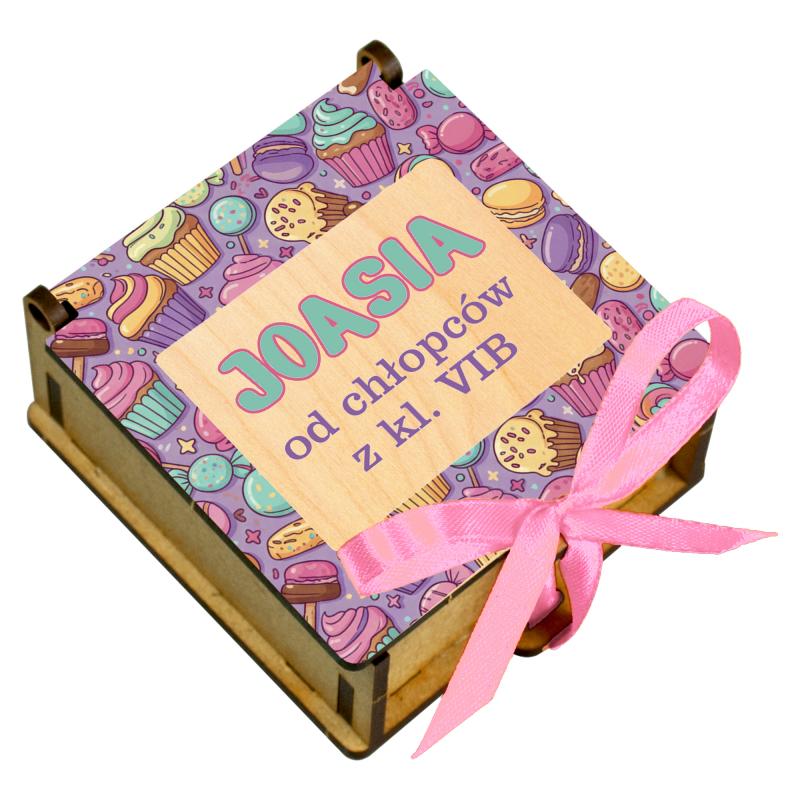 Drewniane pudełko na słodycze to estetyczny i praktyczny upominek, idealny jako prezent klasowy do szkoły lub przedszkola. Kolorowa grafika z imieniem oraz podpisem nadaje całości osobisty charakter i sprawia, że prezent doskonale sprawdzi się na Dzień Kobiet lub inne szkolne okazje.