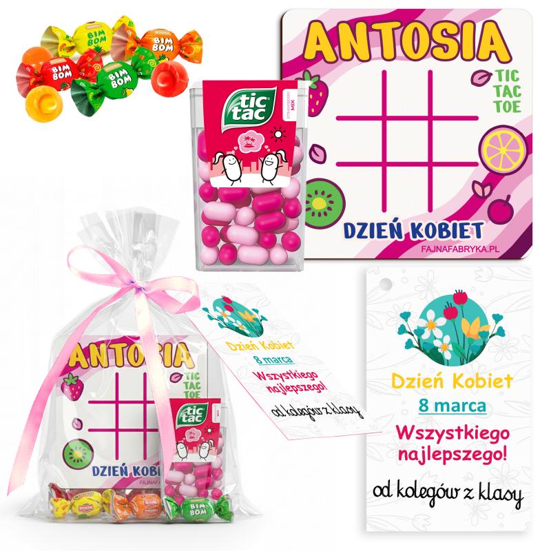 Personalizowany zestaw na Dzień Kobiet z imieniem. Gra kółko i krzyżyk oraz słodkie cukierki, drobny upominek szkolny od klasy.