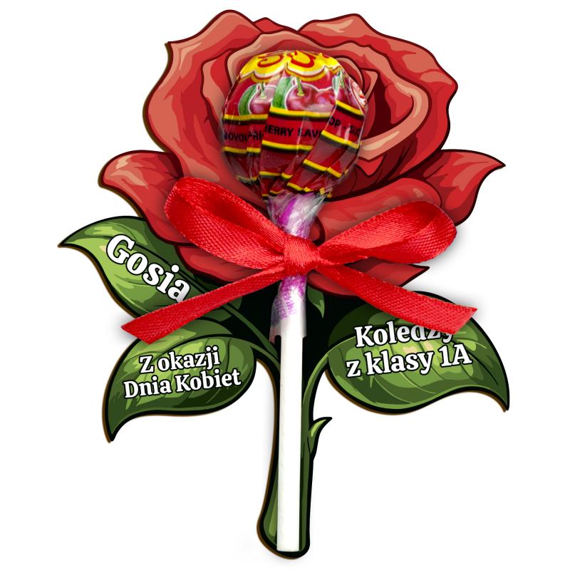 Róża stanowi ozdobną oprawę na lizaka i świetnie sprawdzi się jako drobny prezent wręczany w szkole przez kolegów z klasy lub wychowawcę.
